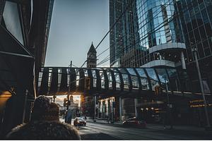 4pm Winter Sunset on Queen street Looking past the Eatons center toward Old City Hall, Toronto, Ontario, Canada.