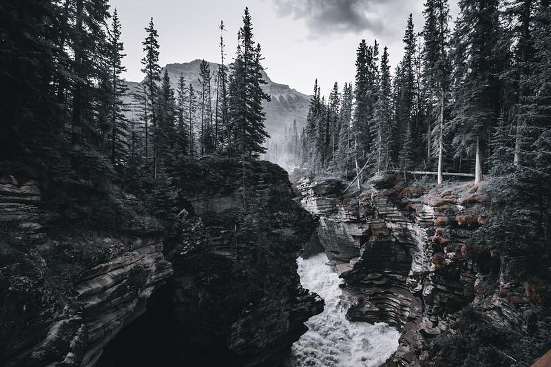 wide angle view of Athabasca falls in Jasper National Park, Alberta, Canada.